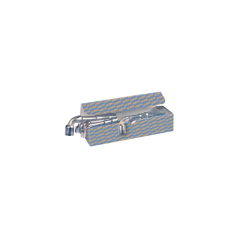 Con bocche aventi la stessa apertura Tipo pesante ricavato dal pieno con foro passante In acciaio al cromo-vanadio - Esecuzione cromata La testa piegata è munita di una apertura passante che consente il serraggio di dadi anche su prigionieri sporgenti - Inoltre è possibile inserire una spina di manovra nel foro passante per utilizzare la chiave a T ed ottenere elevati momenti torcenti Serie di 8 chiavi (mm 6 - 7 - 8 - 10 - 13 - 17 - 19 - 22) In scatola di cartone