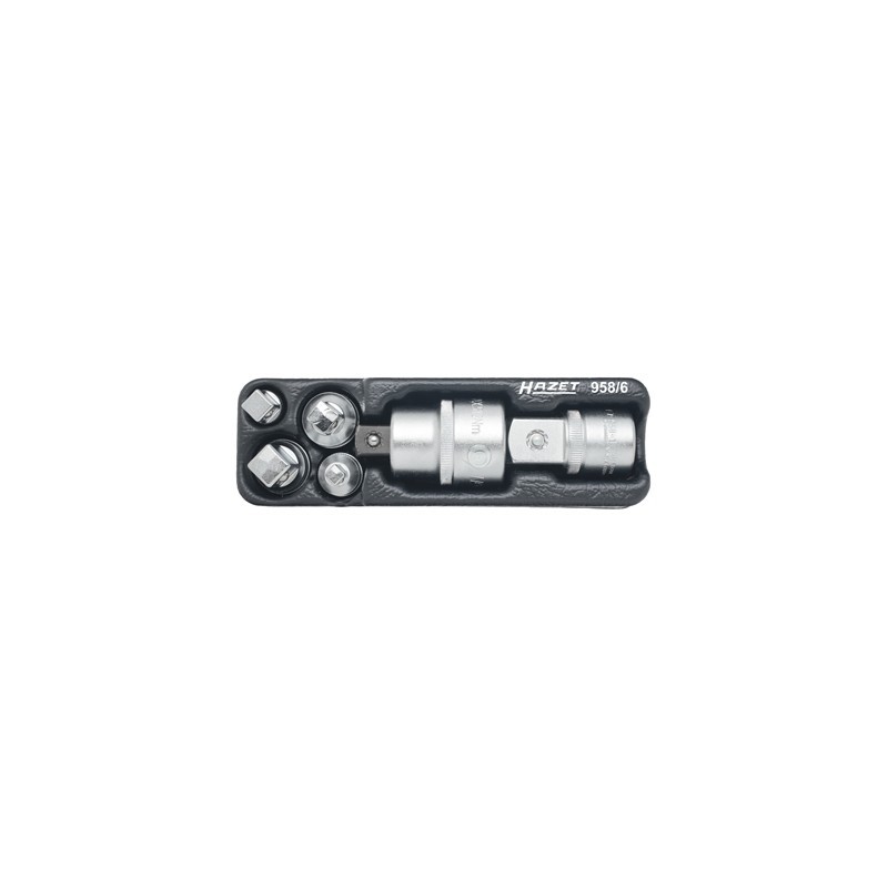 Attacco - In acciaio al cromo-vanadio - Esecuzione cromata - Teste lucide Assortimento di 6 raccordi 3 raccordi aumentatori con attacco e - e - e 3 raccordi riduttori con attacco e - e - e Su termoformato adatto anche per linserimento in cassetti di carrelli portautensili